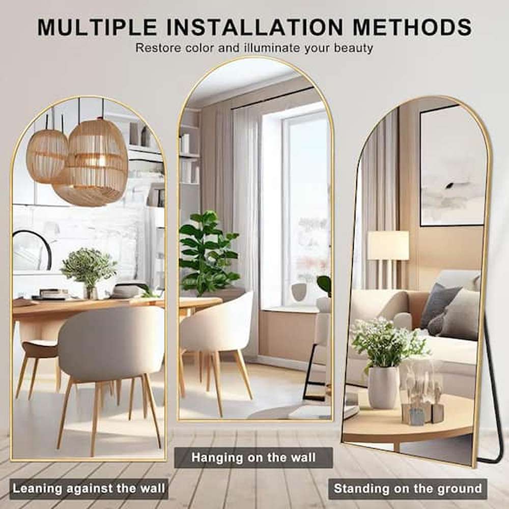 The 32-inch Wide by 71-inch High Oversized Aluminum Alloy Arch Full-Length Gold Wall Mounted Standing Mirror Floor Mirror is a luxurious and versatile addition to any contemporary or elegant interior. Crafted with precision and designed for both style and durability, this mirror combines high-quality materials with a sophisticated aesthetic, making it a perfect focal point in your living space.